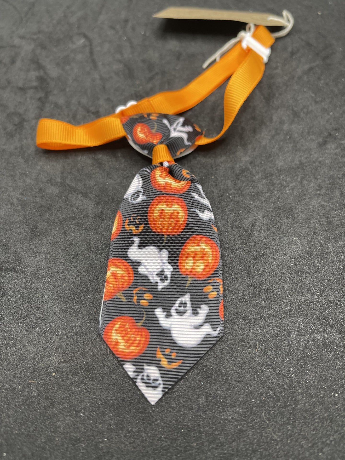 Black pumpkins & ghosts Halloween Tie with orange adjustable strap with snap shut buckle. It features lots of ghosts & pumpkins on it.  Tie is approx 5" long & neck strap adjusts from 8" up to 14". These are part of our Mix & match promotion £3 each or 2 for £5.
